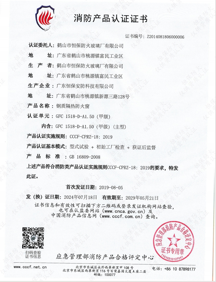 甲級固定防火窗消防產品認證證書: